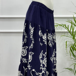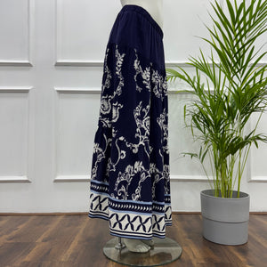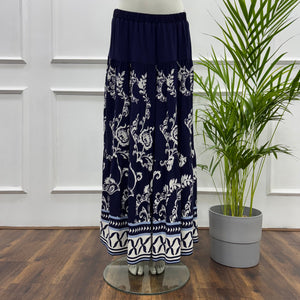 Inner lining adds opacity and prevents see-through for enhanced coverage. Crafted from soft and breathable viscose, this tiered maxi skirt is the perfect choice for summer, offering a lightweight and airy feel that keeps you comfortable all day long. The border print detailing adds a refined touch, making it a standout piece that effortlessly enhances any outfit. Designed to pair beautifully with tunics or oversized shirts, it complements similar tones from the pattern for a harmonious and polished look. Whether styled casually or elegantly, this skirt brings timeless charm and effortless sophistication to your wardrobe.